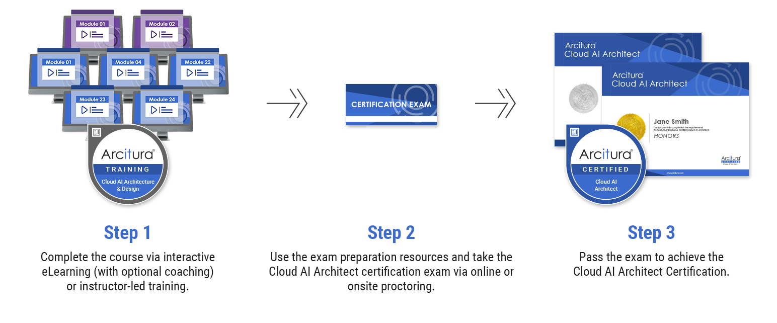 Complete the Cloud AI Architecture & Design course and, optionally, get accredited as a Certified Cloud AI Architect by passing the certification exam. You can purchase the course now and get the exam later, or you can get them together at a discount as part of the Certification Bundle.