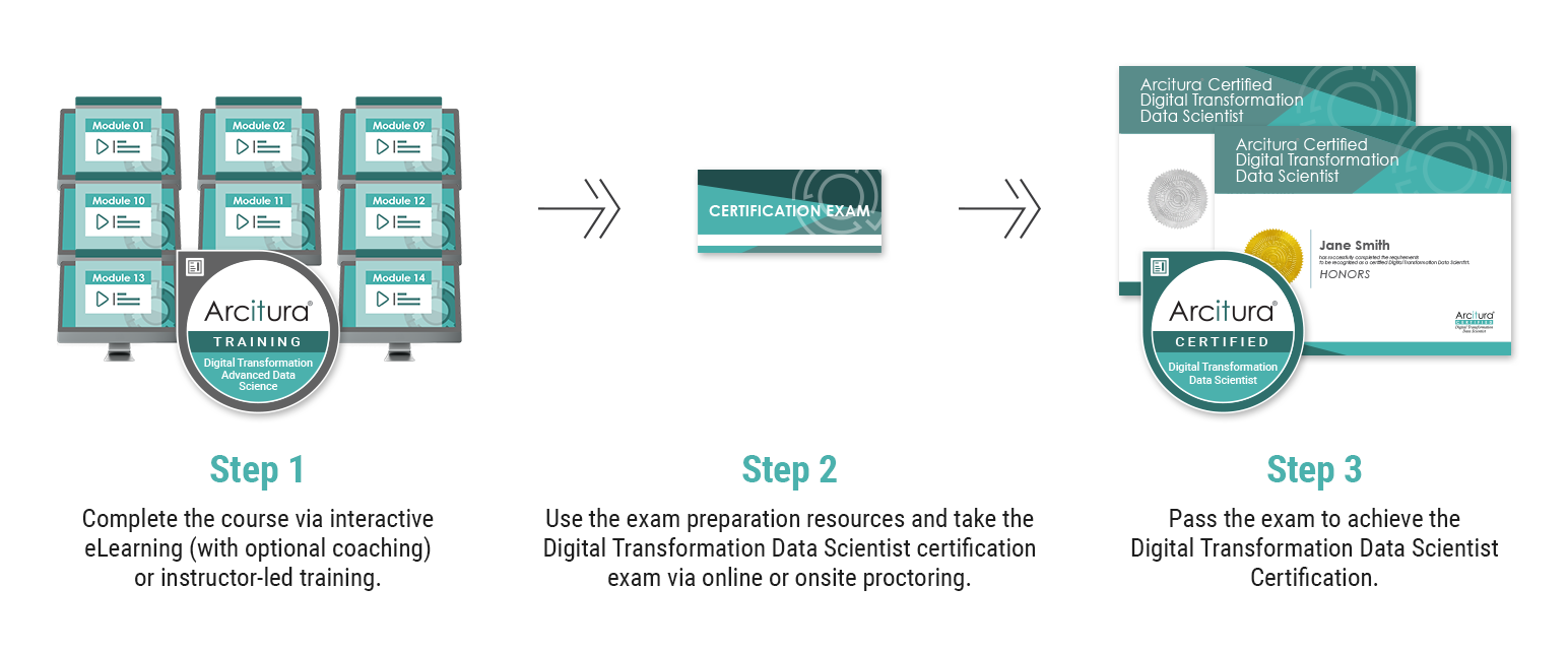 Complete the Digital Transformation: Advanced Data Science course and, optionally, get accredited as a Certified Digital Transformation Data Scientist by passing the certification exam. You can purchase the course now and get the exam later, or you can get them together at a discount as part of the Certification Bundle.